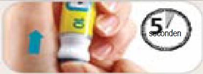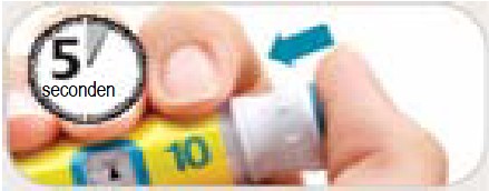 • Druk met uw duim stevig op de injectieknop tot het niet verder kan. Houd dan de injectieknop stevig ingedrukt en tel langzaam tot 5 om de volledige dosis toe te dienen.
